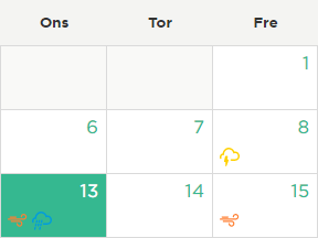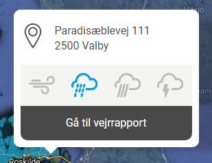 Du får information om de enkelte vejrtyper på den valgte adresse for den valgte dato i pop-up boksen. Der er flere informationer om vejret på flere datoer for den valgte adresse, hvis du går til vejrrapporten via pop-up boksen.