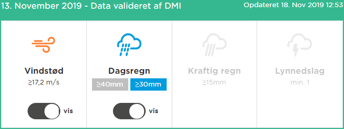 Her kan du slå visning af de forskellige vejrtyper til og fra. Vær opmærksom på at du kan vælge mellem ≥30 mm og ≥40 mm for dagsregn (24 timer)