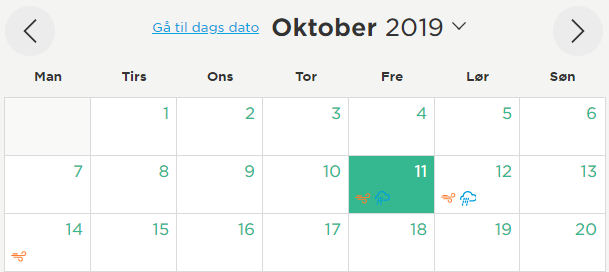 Vælg hvilken dato, du vil se vejrdata for. Er datoen rød er data endnu ikke valideret af DMI. Er datoen grøn er datoen valideret. Se tidligere data ved at klikke på pilen til højre for måneden over kalenderen.